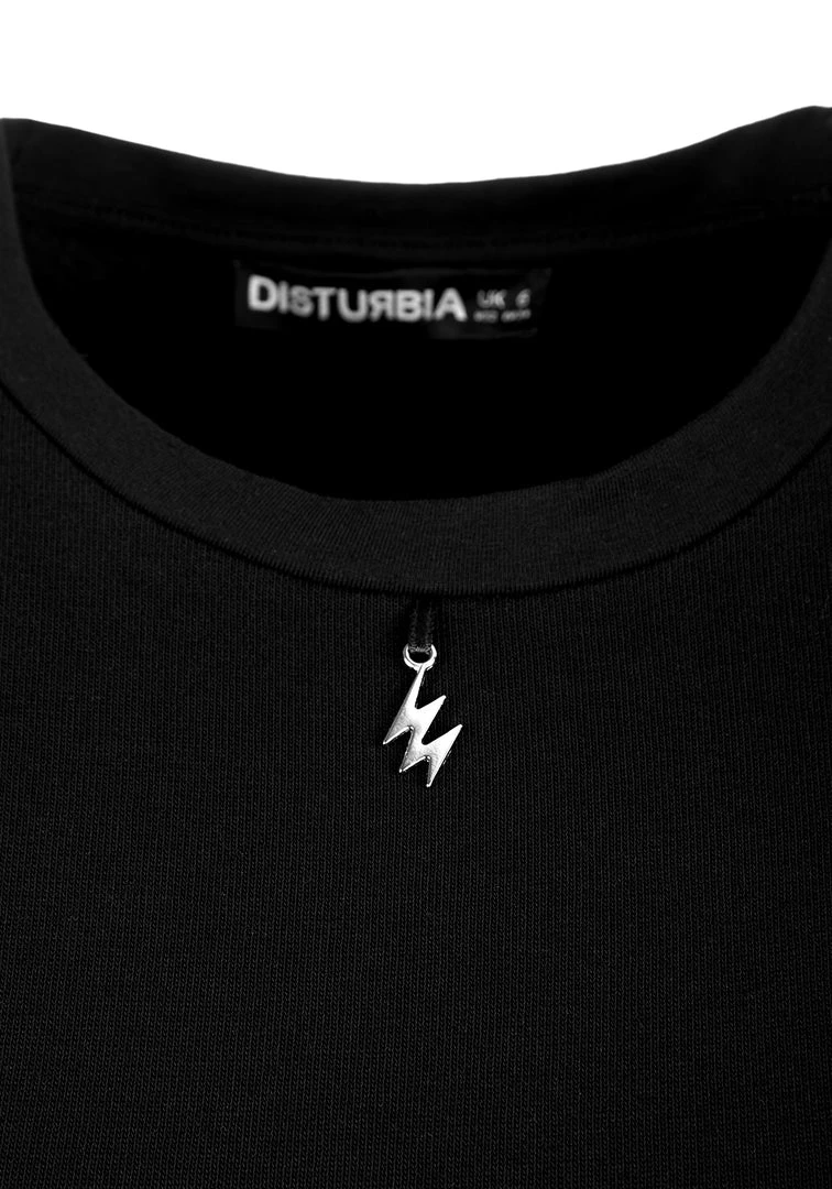 ✧ Silver metal lightning charm hangs from crew neck