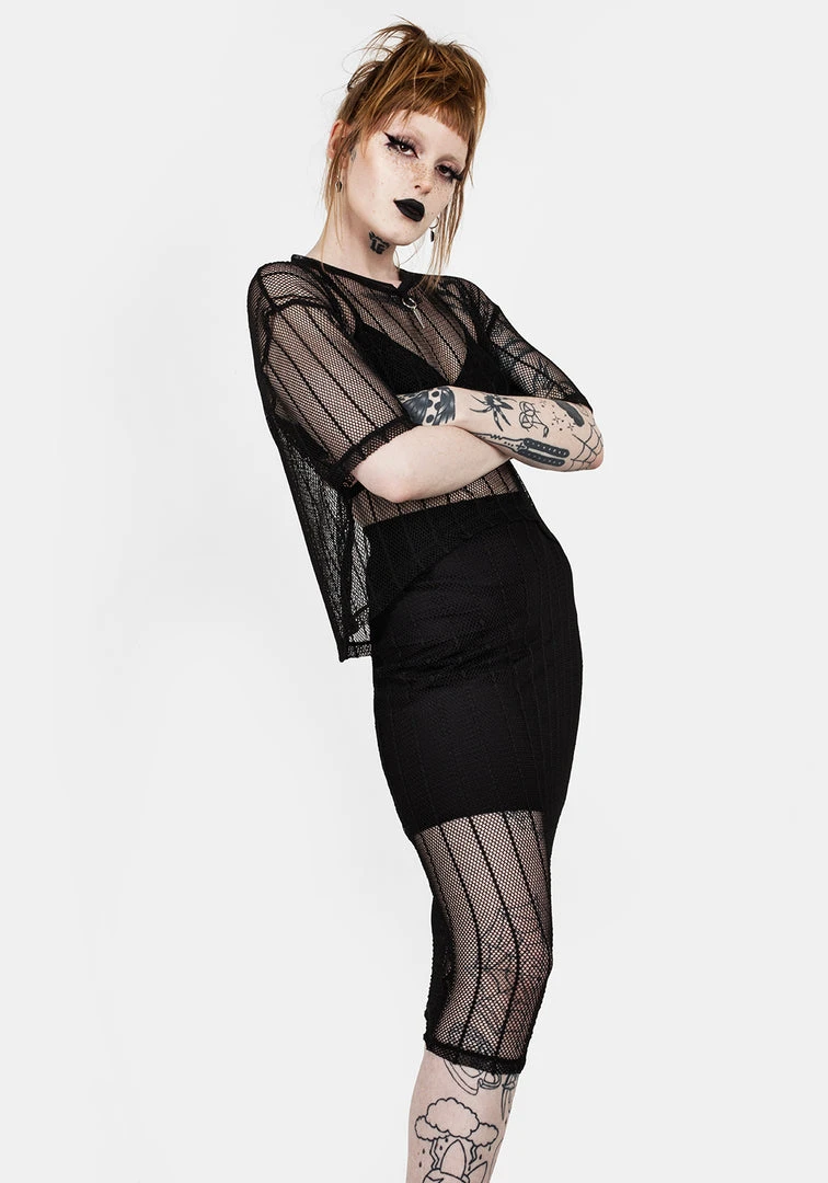 ✦ Black striped mesh midi skirt layered over solid mini slip Â