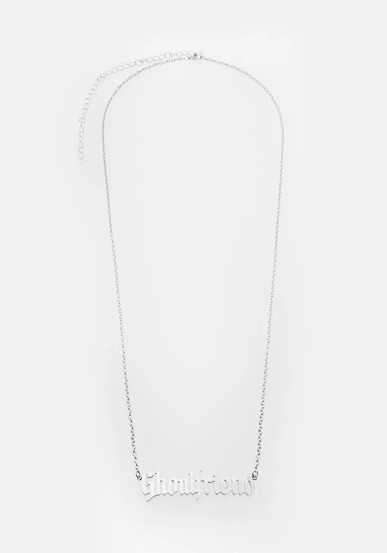 ❥ Bold gothic “Ghoulfriend” script contrasts delicate chain links
