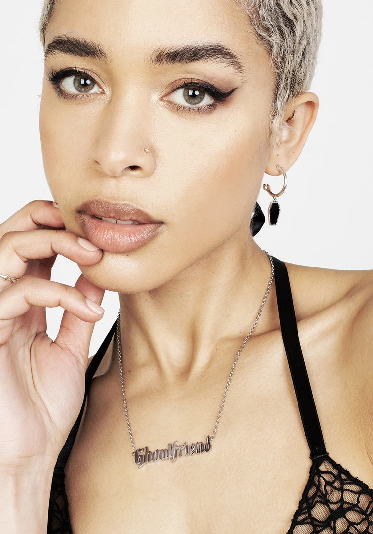 ❥ Bold gothic “Ghoulfriend” script contrasts delicate chain links