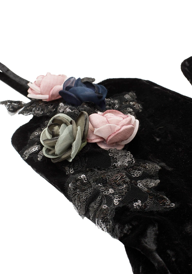 ✦ Applique roses and sequinned foliage adorn asymmetrically Â