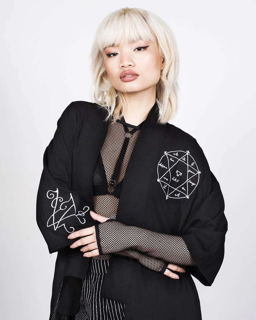 – Long black kimono-style robe with embroidered detailing
