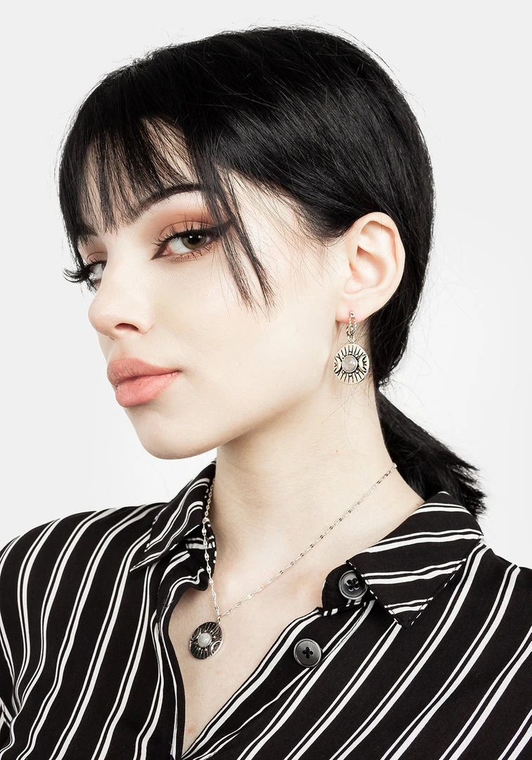 ☾ Triple moon drop earrings with moonstone charm, cut-out sun accents, twisted hoops & hinged fastenings (3.4cm)