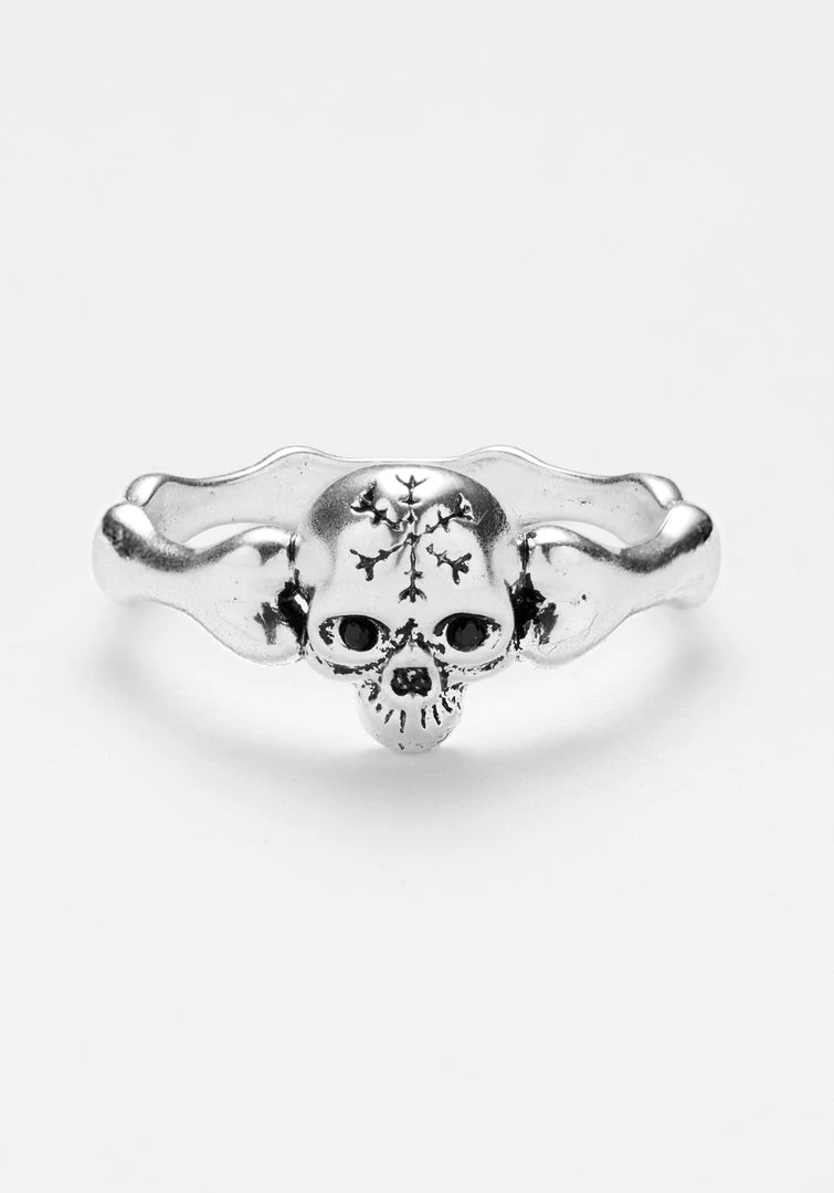 This silver-plated bone ring is accented by a realistic skull head charm, engraved with magick symbol and finished with tiny black agate eyes. Gleaming bones make up the band, which is comfy enough to wear for eternity.