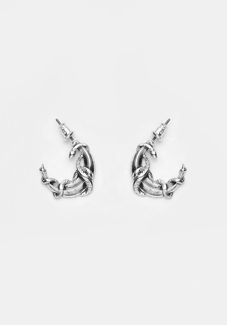 Writhing in the joy of light, a finely detailed serpent coils around a crescent moon. Such otherworldly symbols aren’t often incorporated into easy-to-wear accessories, but these serpent crescent moon earrings are light & dainty enough to bring magick to everyday looks. Each earring is fashioned into silver hoop that comfortably secures with a clutch-back fastening.