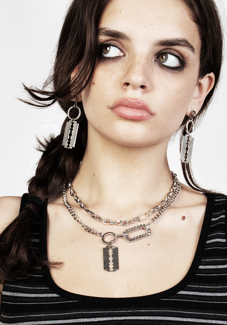 Never have your razor-sharp wit underestimated again with this handy reminder to anyone might forget exactly who they’re talking to. If the silver razor charms dangling from O-rings don’t send the message, maybe the spiked ear stud is the touch needed to let enemies know they need to keep their distance or face the consequences. (Don’t worry too much about people getting too close, though: as threatening as they look, these charming drop earrings are as blunt as your attitude.) Â